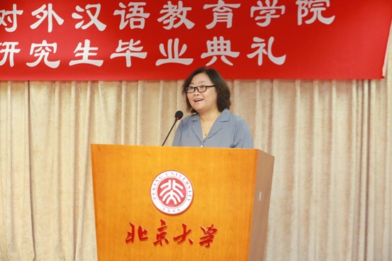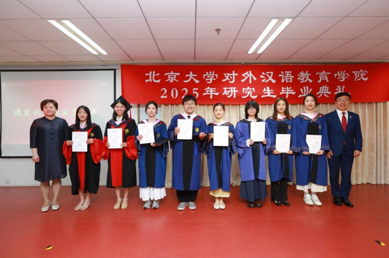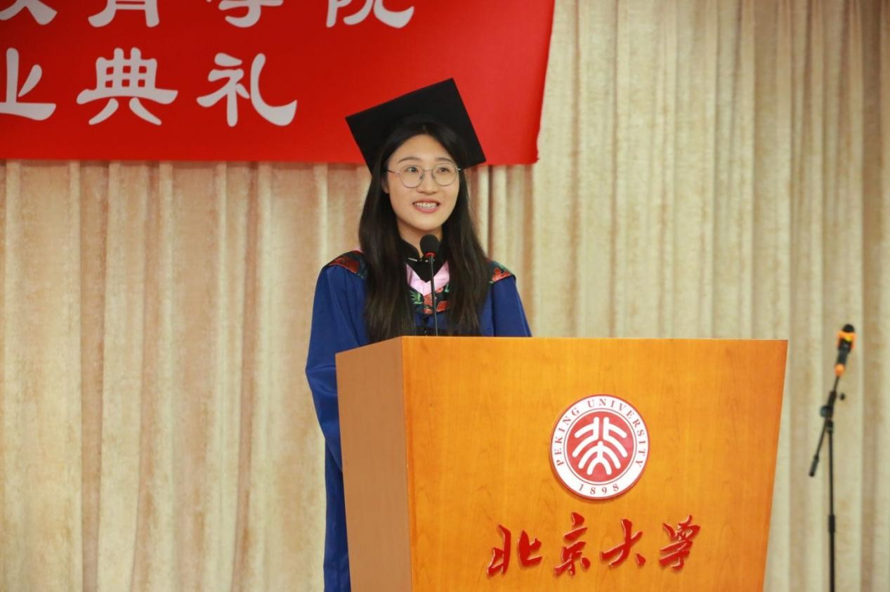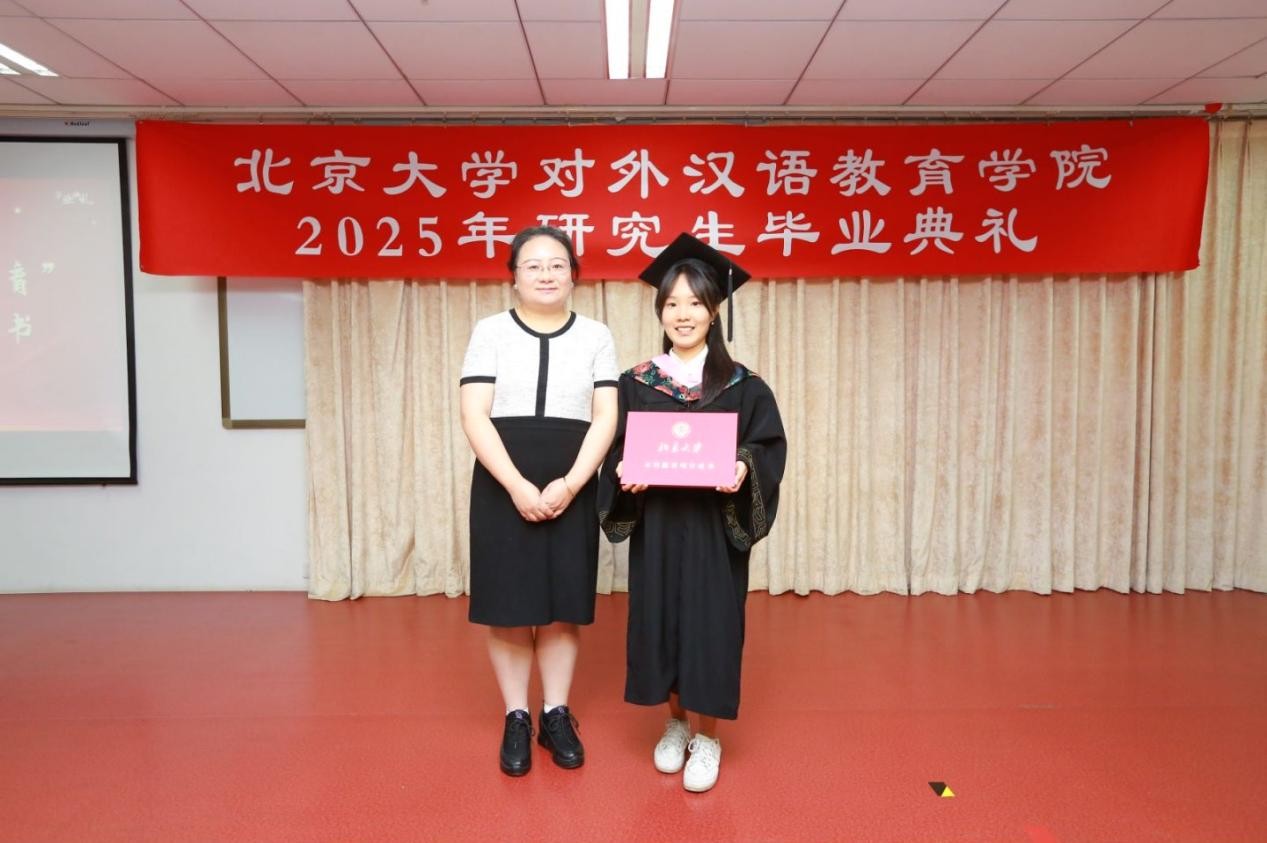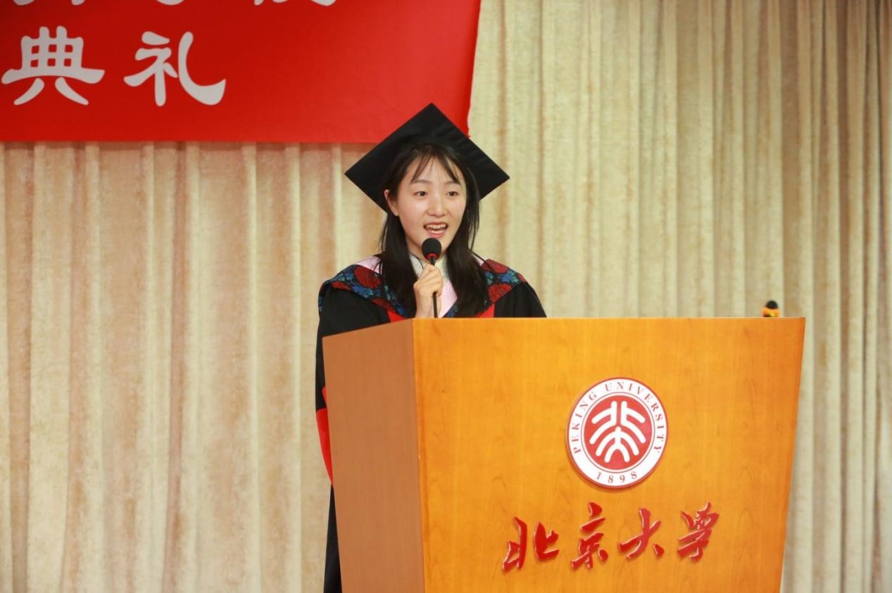 2025届博士毕业生代表杜月明发言。杜月明回顾了四年博士生涯的成长与感悟。她表示,汉院是学术与生活交织的沃土。在这里,同学们既深耕语言研究与文化探索,也在窗边的暖阳中体味生活的诗意,将学术作为通向真实世界的桥梁。面对未来,她呼吁毕业生以热爱为帆、责任为锚,在语言与文化的传播中践行北大汉院人的使命,以责任连接起语言与世界,以热爱传递文化的温度。